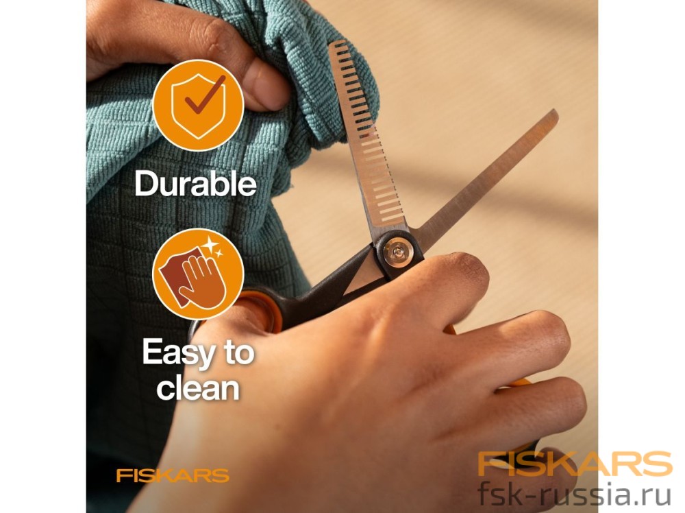 Ножницы для животных PET FISKARS арт. 2009128 — это филировочные ножницы для деликатного прореживания шерсти, плавного “смешивания” переходов и уменьшения объема при груминге собак. Они помогают получить более естественный результат после стрижки, когда нужно мягко снять густоту без резких линий. Благодаря зубчатой филировочной кромке ножницы текстурируют шерсть и равномерно убирают лишний объем. Лезвия из нержавеющей стали с фаской рассчитаны на длительную остроту, а 5-точечный контроль хвата и рукоятка SoftGrip™ обеспечивают точность и комфорт.